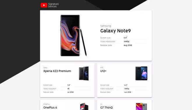 Google a publié une liste de smartphones qui désigne les meilleurs terminaux pour visionner des vidéos sur la plateforme. Nommée « YouTube Signature Devices » cette liste rassemble les appareils qui offrent « la meilleure expérience de YouTube en combinant technologies de pointe, performances vidéo et fiabilité. »