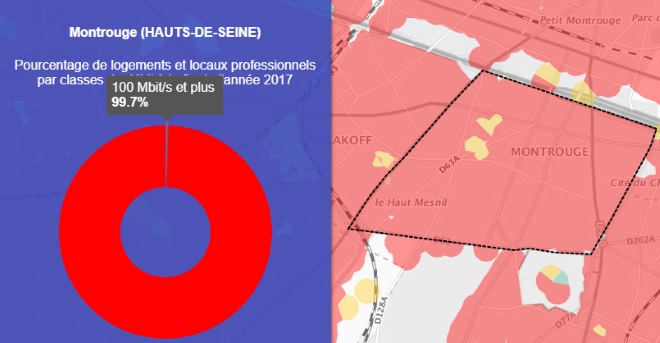 Grâce à la première carte on peut voir que la ville de Montrouge est couverte à 99.7% par le très haut débit.
