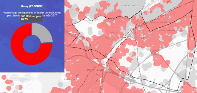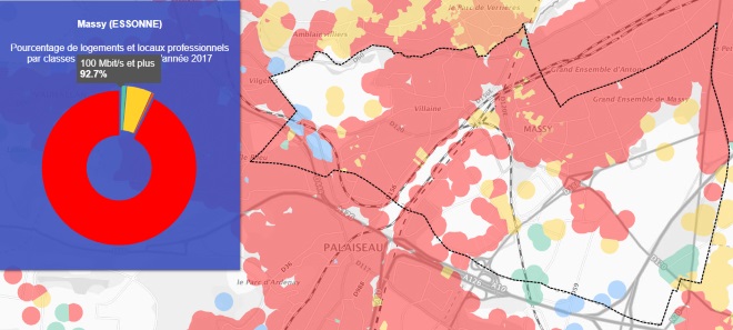 Grâce à la première carte on peut voir que la ville de Massy est couverte à 93.3% par le très haut débit.