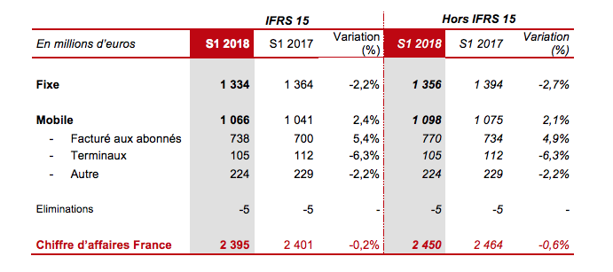 C’est certainement l’une des seules bonnes nouvelles de la journée pour Iliad, la marge d’Ebitda en France, autrement dit l’excédent brut d’exploitation grimpe à 37,3 % au premier semestre, contre 36,4 % un an plus tôt. Le groupe de Xavier Niel peut toujours espérer atteindre son objectif de 40 % en 2020. Côté chiffre d’affaires global dans l’hexagone, celui est en recul de 0,2% sur les six premiers mois de l’année à 2,3 milliards d’euros soit une baisse de 1,2% uniquement sur le second trimestre. La faute aux revenus sur le fixe en recul de -2,2% sur le semestre à 1,3 milliards d’euros, soit une baisse d’environ 1,4% entre le T1 et T2. Ceux-ci ont été négativement "impactés par un environnement concurrentiel, la hausse de la TVA, et le poids des promotions", précise à ce propos un communiqué. Sur le mobile, les résultats sont meilleurs, le chiffre d’affaires est en augmentation de 2,4% sur le semestre à 1,066 milliards d’euros mais rapporté au trimestre, l’augmentation n’est que de 0,7%.