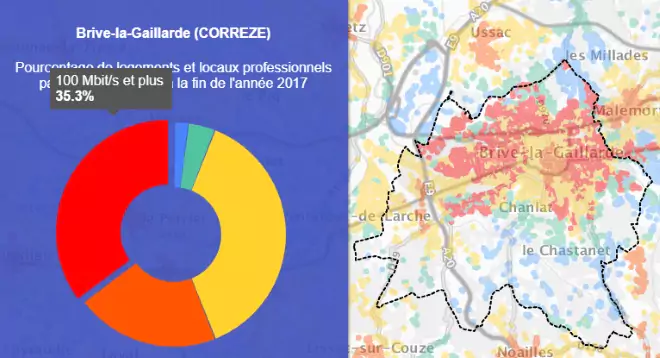 Grâce à la première carte on peut voir que la ville de Brive-la-Gaillarde est couverte à 56.1% par le très haut débit.