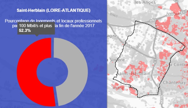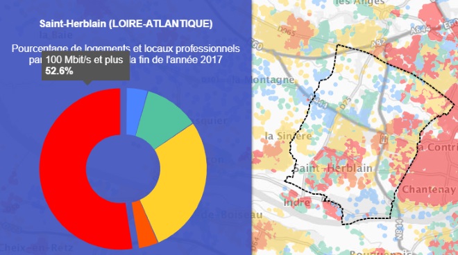 Grâce à la première carte on peut voir que la ville de Saint-Herblain est couverte à 56.6% par le très haut débit.
