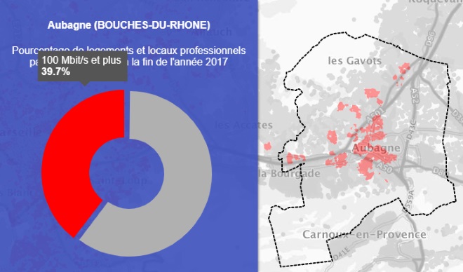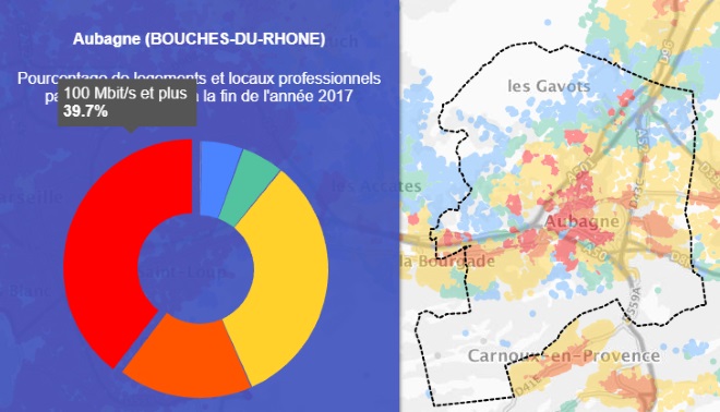 Grâce à la première carte on peut voir que la ville de Aubagne est couverte à 56.7% par le très haut débit.