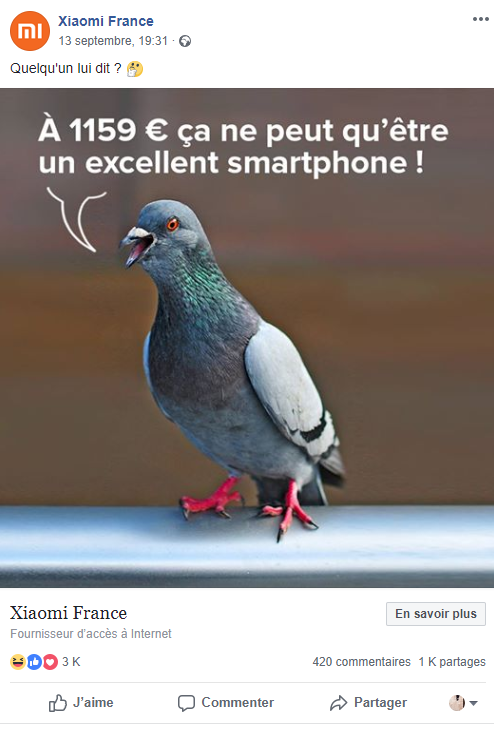 De plus en plus cher. En dégainant ses iPhone Xs et Xs Max actuellement disponibles en précommande, Apple est sur toutes les lèvres pour le meilleur comme pour le pire. Sa réputation de marque de luxe est encore une fois confirmée et ses carences en matière d’innovation technique, de plus en plus décriées. En atteste ses nouveaux flagship dont les prix oscillent entre 1159€ et 1649 €. Du jamais vu chez la marque à la pomme et cela n’est pas passé dans l’oreille d’un sourd. En réaction, le fabricant chinois Xiaomi a opté sur son compte Facebook pour une simple photo de pigeon symbolisant les utilisateurs prêts à débourser un Smic voire davantage pour s’offrir l’un des nouveaux bébés d’Apple.