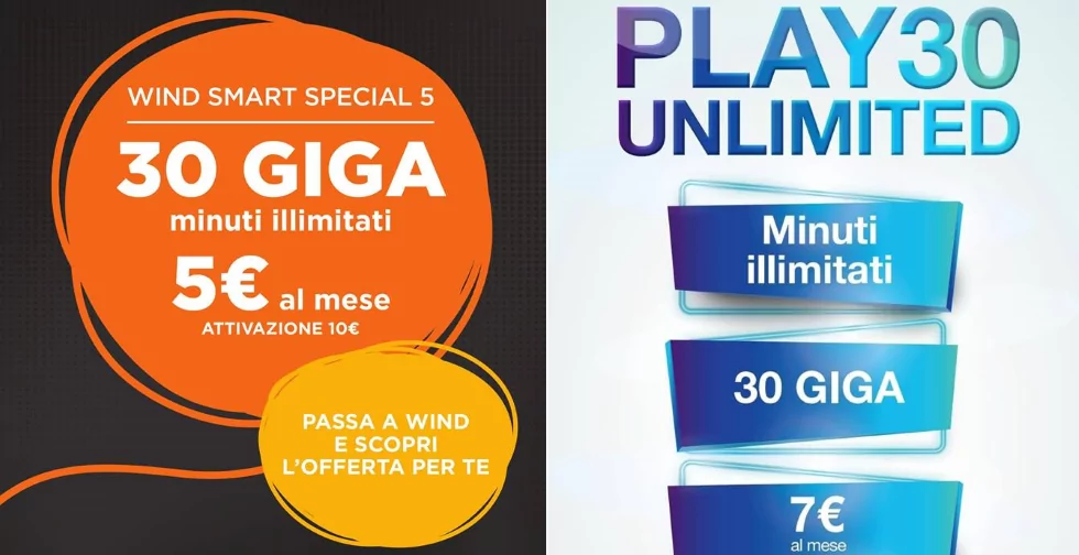 Wind Smart Special 5, avec appels illimités vers tous les numéros nationaux ainsi que 30Go de data en 4G est proposée pour 5 euros/mois. En provenant des autres opérateurs (Vodafone ou Telecom Italia) la même offre est disponible, mais pour 8 euros/mois.