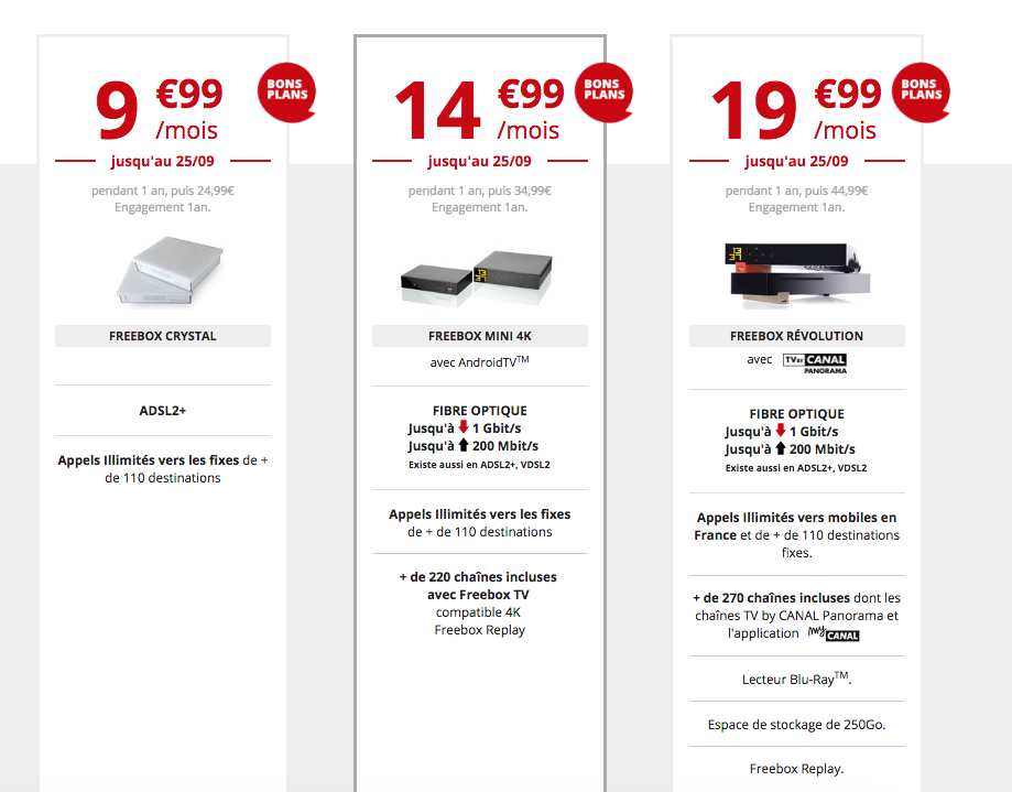 Pour rappel, en mai dernier, Free a lancé ses nouvelles offres, faisant ainsi évoluer son système de tarification en s’alignant sur ses concurrents. Les offres historiques sont, elles, toujours disponibles. Fin juin sont apparus les "Bons plans de l’été". Comme auparavant, les trois offres Freebox affichent un tarif beaucoup plus bas la 1ère année qui augmente par contre à partir de la 2ème année. A noter qu’il y a des frais de mise en service de 49€, et des frais de résiliation de 49€, mais que les frais de résiliation sont remboursés à hauteur de 100 euros.