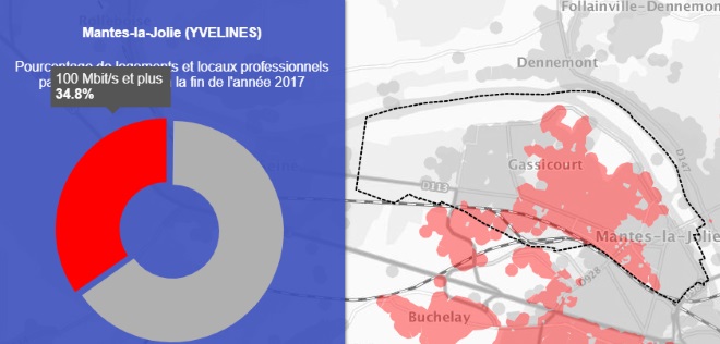 Grâce à la première carte on peut voir que la ville de Mantes-la-Jolie est couverte à 97.2% par le très haut débit.