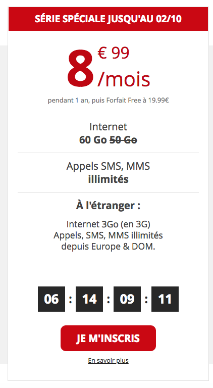 Et ça continue encore et encore. Lancé début juillet puis renouvelé à la rentrée avec 10 Go supplémentaires de data, le forfait "série spéciale" 60 Go à 8,99€/mois la première année de Free Mobile vient d’être une nouvelle fois prolongé d’une semaine.