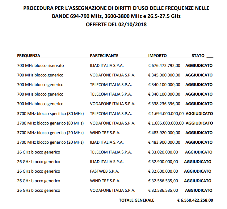 Au terme de 14 jours d’encheres folles qui commençaient à essoufler meme l’opérateur historique Telecom Italia, chahuté en bourse, tous les lots mis en jeu ont été attribués pour un montant total de 6 550 422 258 euros. Montant qui dépasse de plus de 4 milliards le minimum fixé avant l’ouverture des enchères.