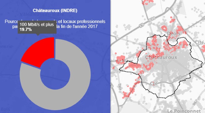 Grâce à la première carte on peut voir que la ville de Châteauroux est couverte à 28.4% par le très haut débit.