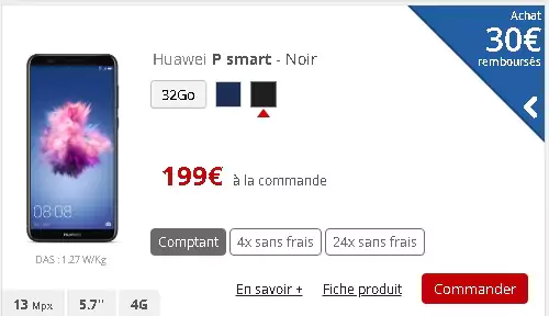 Huawei P Smart : son tarif passe de 229€ à 199€ en paiement comptant soit 30€ de baisse. Ce tarif est valable également pour le paiement en plusieurs fois sans frais : 4 fois : 52€ puis 49€*3 ou 24 fois : 31€ puis 7€*24. Par ailleurs, ce smartphone bénéficie actuellement d’une offre de remboursement de 30€, ce qui porte son tarif final à 169€