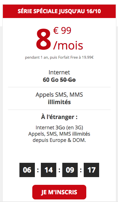 Lancé début juillet puis renouvelé à la rentrée avec 10 Go supplémentaires de data, le forfait "série spéciale" 60 Go à 8,99€/mois la première année de Free Mobile vient d’être une nouvelle fois prolongé. Comme chaque semaine, le compte a rebours a pris fin à minuit avant de repartir de plus belle ce matin. Dorénavant, cette offre est disponible jusqu’au 16 octobre. Celle-ci inclut :