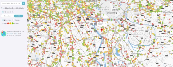 Selon les résultats des tests effectués par les abonnés Free Mobile, les zones rouges ont un débit inférieur à 20Mb/s, pour les zones jaunes le débit est compris entre 20 et 60Mb/s et pour les zones vertes le débit est au dessus de 60Mb/s.