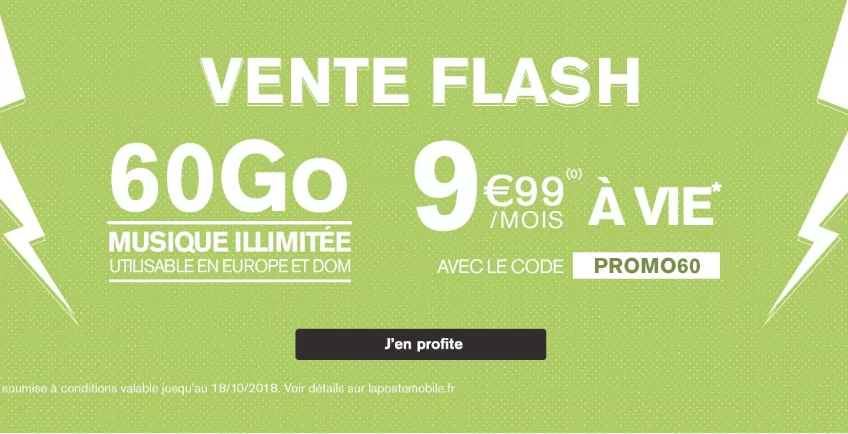 Jusqu’au 18 octobre prochain, le MVNO lance une vente flash et brade son forfait 60 Go à 9,99€/mois, soit une remise mensuelle de 9€ via un code promo, sans condition de durée.
