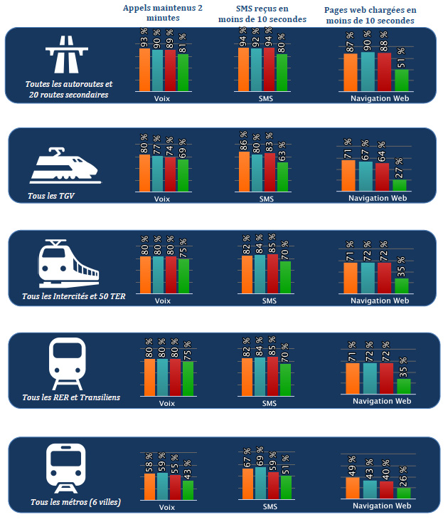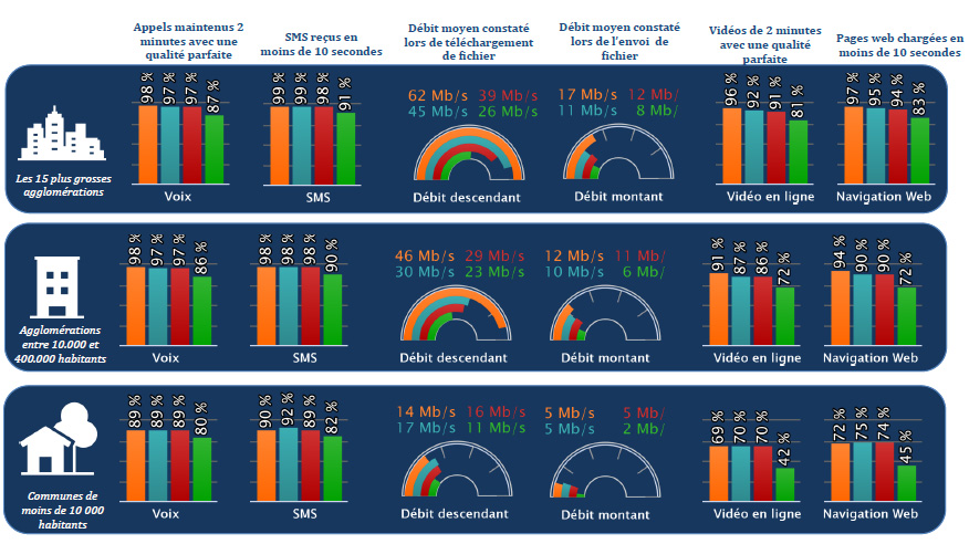 Dans cette campagne 2018, plus d’un million de mesures en 2G, 3G et 4G ont été réalisées sur l’ensemble du territoire, dans tous les départements que ce soit à l’intérieur et à l’extérieur des bâtiments et dans les transports, à savoir tous les TGV, intercités, RER, métros, autoroutes mais aussi une vingtaine d’axes routiers secondaires et plus de 50 TER. Comme toujours, l’enquête s’est orientée sur les services mobiles les plus répandus comme la navigation web, la lecture de vidéo, le transfert de données, SMS et appels vocaux.