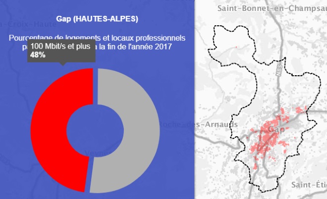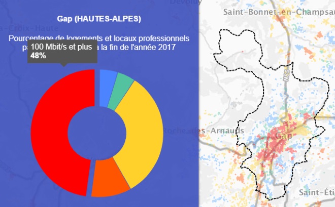 Grâce à la première carte on peut voir que la ville de Gap est couverte à 58.2% par le très haut débit.