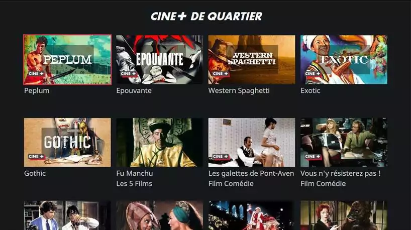 Après Ciné+ Horreur et Ciné Western cet été, puis Ciné+ UK il y a quelques semaines, Canal vient de lancer une nouvelle chaîne de cinéma à la demande : Ciné+ de quartier. Il s’agit d’une chaîne dédiée au cinéma d’exploitation catégorisé Z ou "bis" selon les cinéphiles, mais qui fait partie intégrante de la grande histoire du 7ème Art. Cette chaîne sera animée par de nombreuses collections.