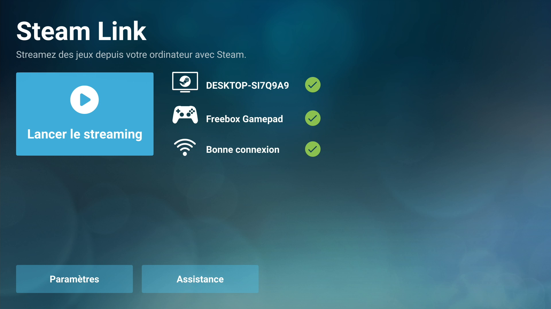 Vous recevrez, une fois le pin entré, une notification validant votre connexion. C’est une opération à réaliser uniquement lorsqu’un nouvel ordinateur doit être connecté. L’application lancera ensuite un diagnostique sur votre connexion, la présence d’une manette, et vous êtes déjà arrivé sur l’interface de l’application. Il n’y’a plus qu’à lancer le streaming.
