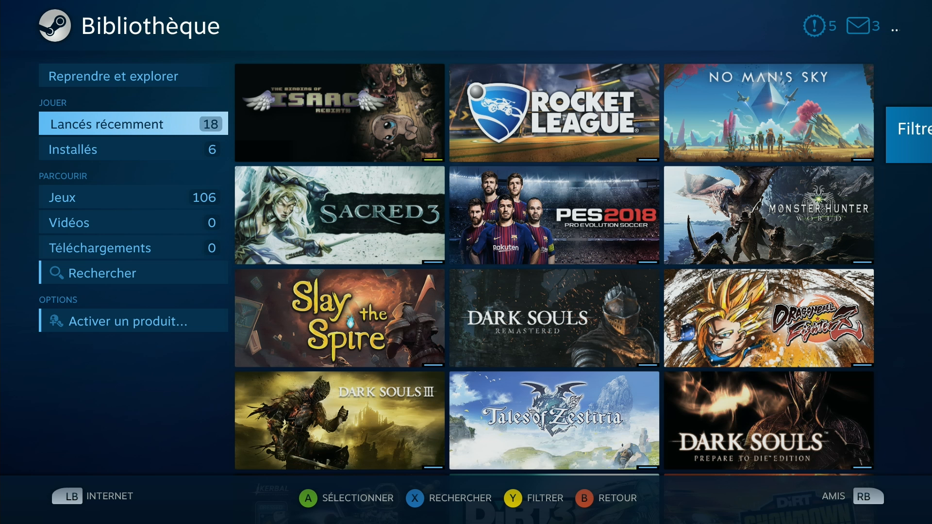 Vous arrivez ensuite sur une interface Steam simplifiée, vous proposant d’accéder à différents onglets. Ici, pour jouer, vous n’aurez qu’à sélectionner votre bibliothèque. Et là-dessus, toutes les données de votre compte steam sont disponibles, vos jeux, votre progression…