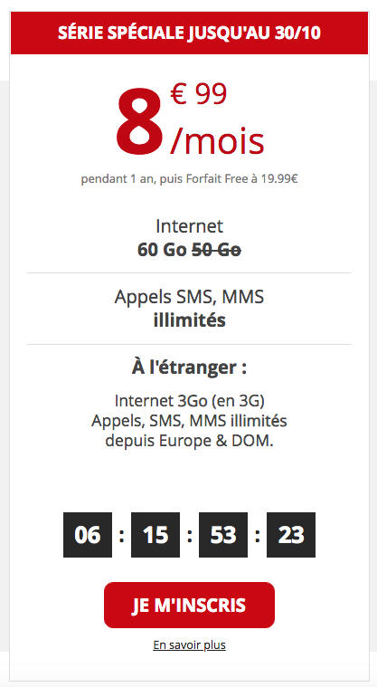 La ritournelle. Lancé le 12 juillet dernier puis renouvelé à la rentrée avec 10 Go supplémentaires de data, le forfait "série spéciale" 60 Go à 8,99€/mois la première année de Free Mobile vient d’être une nouvelle fois prolongé jusqu’au mardi 30 octobre.