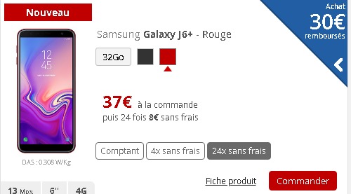 La boutique en ligne de Free Mobile vient d’accueillir un nouveau coloris pour la Samsung Galaxy J6+. Il était jusque là disponible en Noir il l’est maintenant en rouge. Il est proposé au même tarif, à 229€ en paiement comptant mais également en 4 fois sans frais : 58€ puis 57€*3 et en 24 fois sans frais : 37€ puis 8€*24. Par ailleurs ce smartphone bénéficie d’une offre de remboursement de 30€. Vous pouvez retrouver tous les détails ici