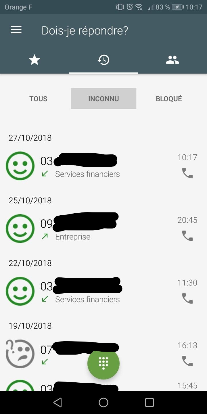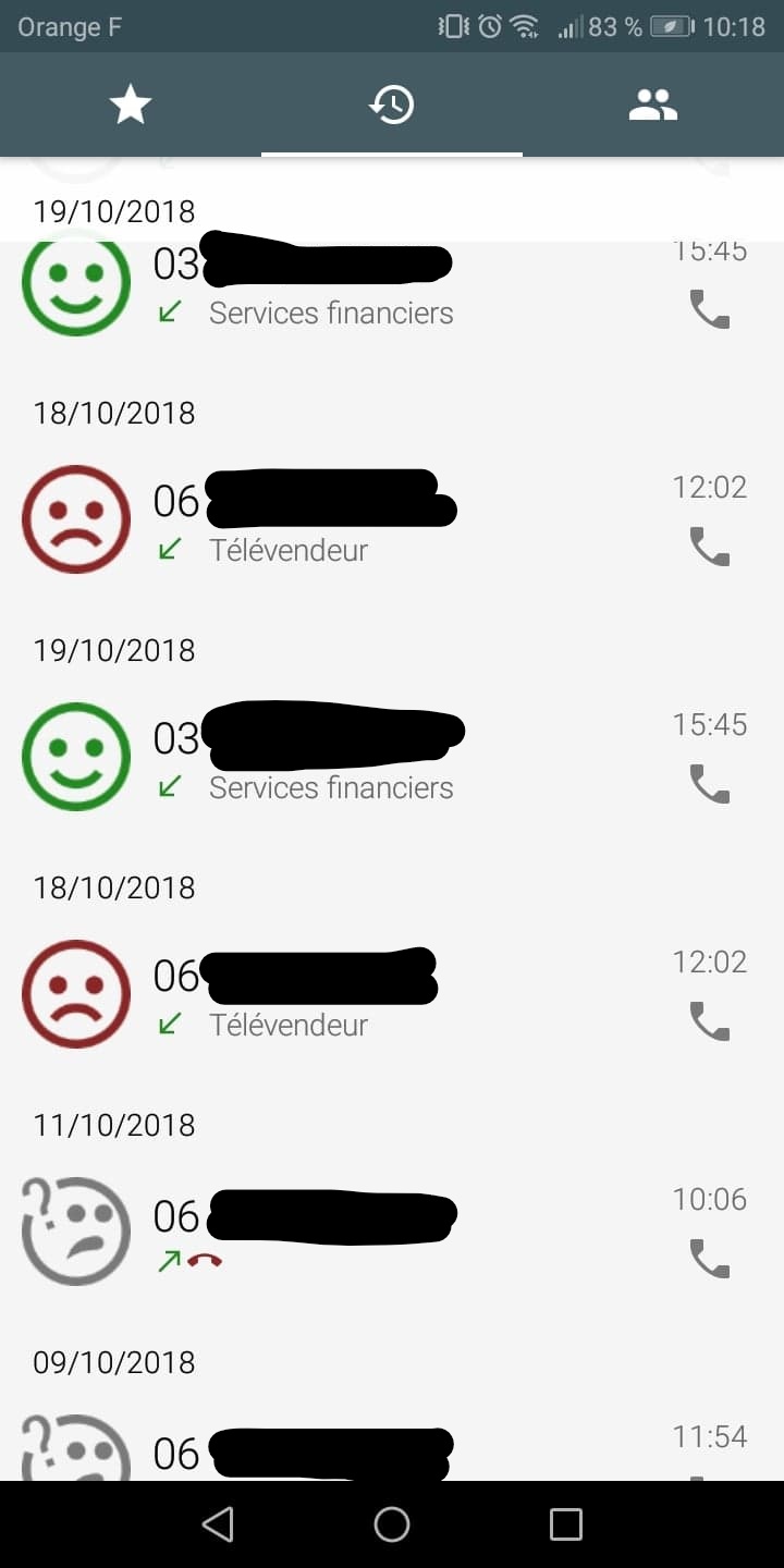 Ainsi vous repérerez très vite les numéros sains (en vert et souriants), les numéros indésirables (en rouge, triste) et vous connaîtrez la teneur de ces appels (en dessous)