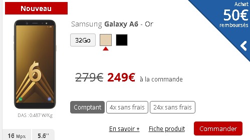 – Samsung A6 : prix exceptionnel de 249€ au lieu de 279€ soit 30€ de réduction. Cette baisse de tarif est également appliquée sur le paiement en plusieurs fois sans frais : 4X : 63€ puis 62€*3 ou 24X : 57€ puis 8€*24. Ce smartphone bénéficie par ailleurs d’une offre de remboursement de 50€