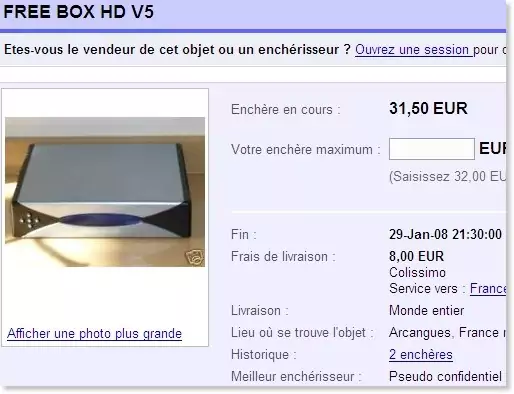 Mise à jour 22h30 : Une seconde Freebox HD + une Freebox V5-ADSL sont en vente sur Ebay ! L’enchère a débuté aujourd’hui avec une mise à prix de 1 € et s’achèvera le 3 février 2008. A cette heure, l’ensemble a atteint, la somme de 61 €
