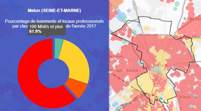 Grâce à la première carte on peut voir que la ville de Melun est couverte à 61.9% par le très haut débit.