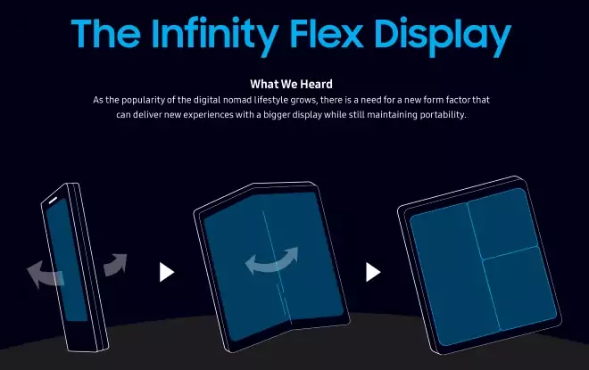 Justin Denison, vice-président marketing mobile de Samsung a annoncé : « L’écran Infinity Flex Display représente une toute nouvelle plateforme mobile ». « Nous vivons dans un monde où la taille de votre écran ne peut être que celle de l’appareil lui-même. Nous avons ajouté une nouvelle dimension pour vous aider à naviguer, regarder et faire du multitâche comme jamais auparavant. »