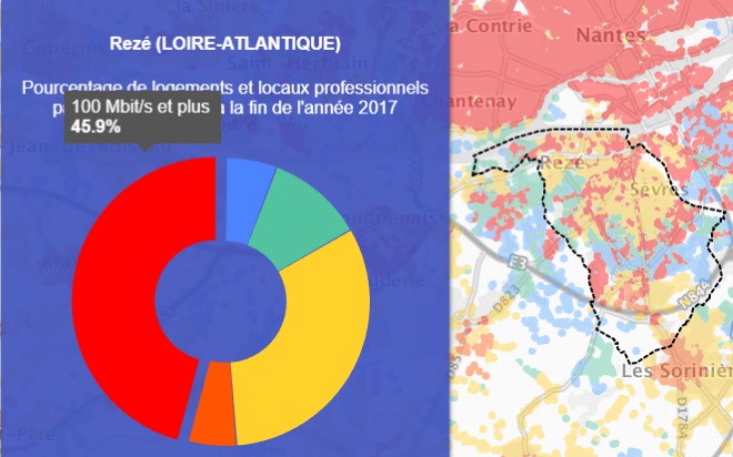 Grâce à la première carte on peut voir que la ville de Rezé est couverte à 51.3% par le très haut débit.