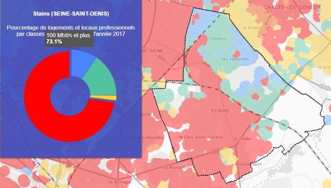 Grâce à la première carte on peut voir que la ville de Stains est couverte à 73.1% par le très haut débit.