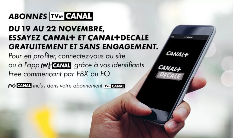 Une bonne nouvelle pour les "abonnés TV by CANAL", Free vient d’annoncer sur Twitter que ceux-ci peuvent dès aujourd’hui et jusqu’au jeudi 22 novembre essayez CANAL+ et CANAL+ Décalé gratuitement et sans engagement depuis le site ou l’appli myCANAL ! Alors, à vos identifiants !