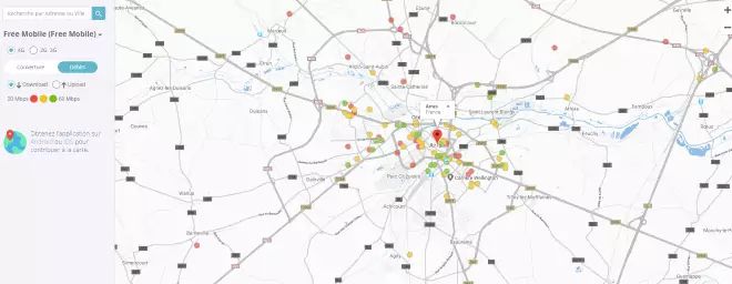 Selon les résultats des tests effectués par les abonnés Free Mobile, les zones rouges ont un débit inférieur à 20Mb/s, pour les zones jaunes le débit est compris entre 20 et 60Mb/s et pour les zones vertes le débit est au dessus de 60Mb/s.