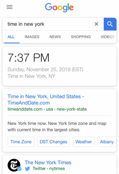 Si la question n’est pas assez claire, le géant américain proposera la réponse factuelle en premier, puis déroulera une liste de résultats classique se basant sur votre formulation comme à l’accoutumée. Le site searchengineland a d’ailleurs démontré ce fait, notamment en demandant l’heure de New York et en voyant que le moteur de recherche propose à la fois l’heure mais aussi le site du New York Times, logique quand la question comprends tous les mots composant le journal.