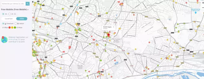 Selon les résultats des tests effectués par les abonnés Free Mobile, les zones rouges ont un débit inférieur à 20Mb/s, pour les zones jaunes le débit est compris entre 20 et 60Mb/s et pour les zones vertes le débit est au dessus de 60Mb/s.