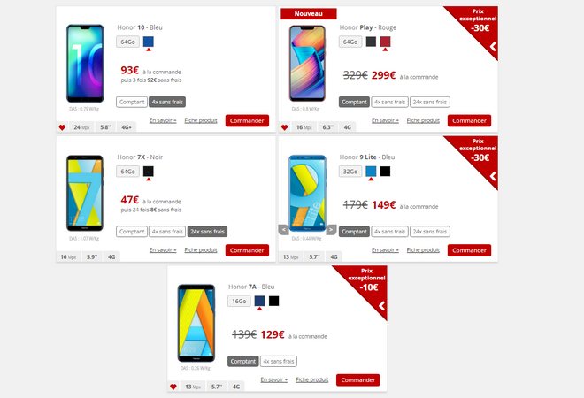 Si vous êtes un adepte de la marque Honor, notez que d’autres modèles bénéficient de prix promotionnels. Le Honor 7A, en entrée de gamme, s’affiche à 129 euros au lieu de 139, et le Honor Play, destiné aux joueurs sur mobile, à 299 euros au lieu de 329 euros.