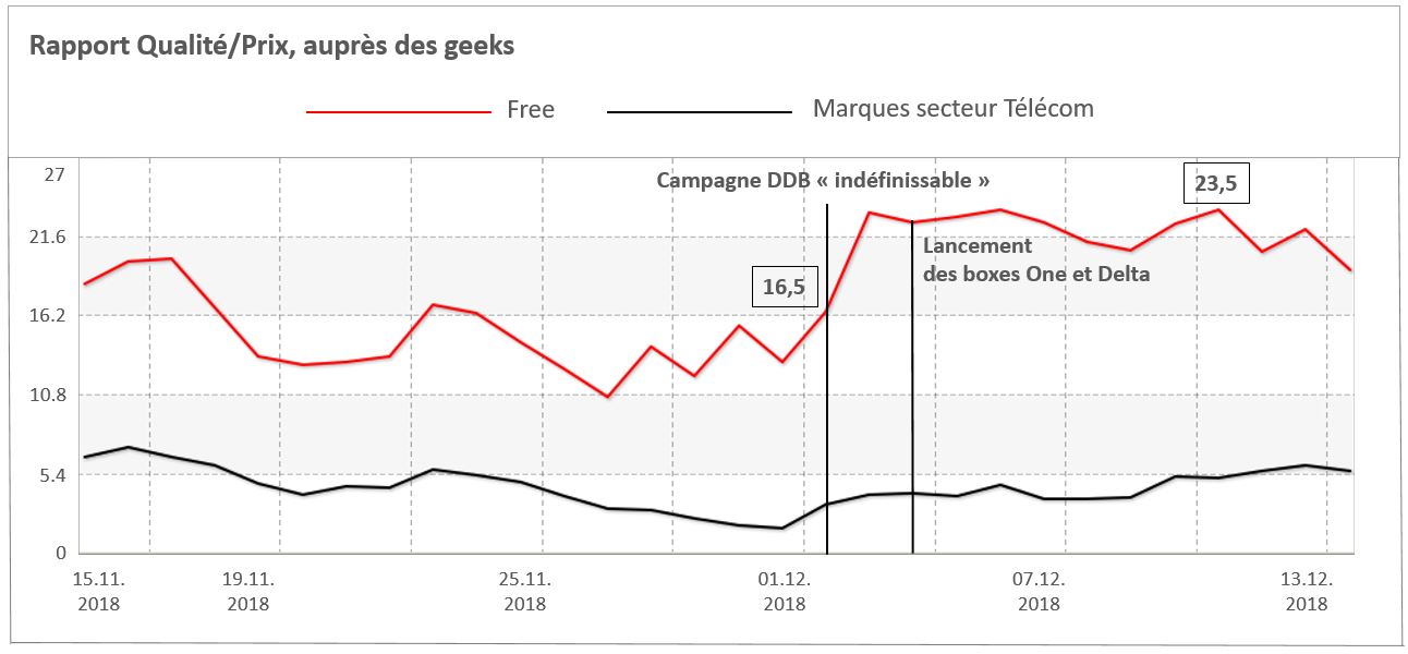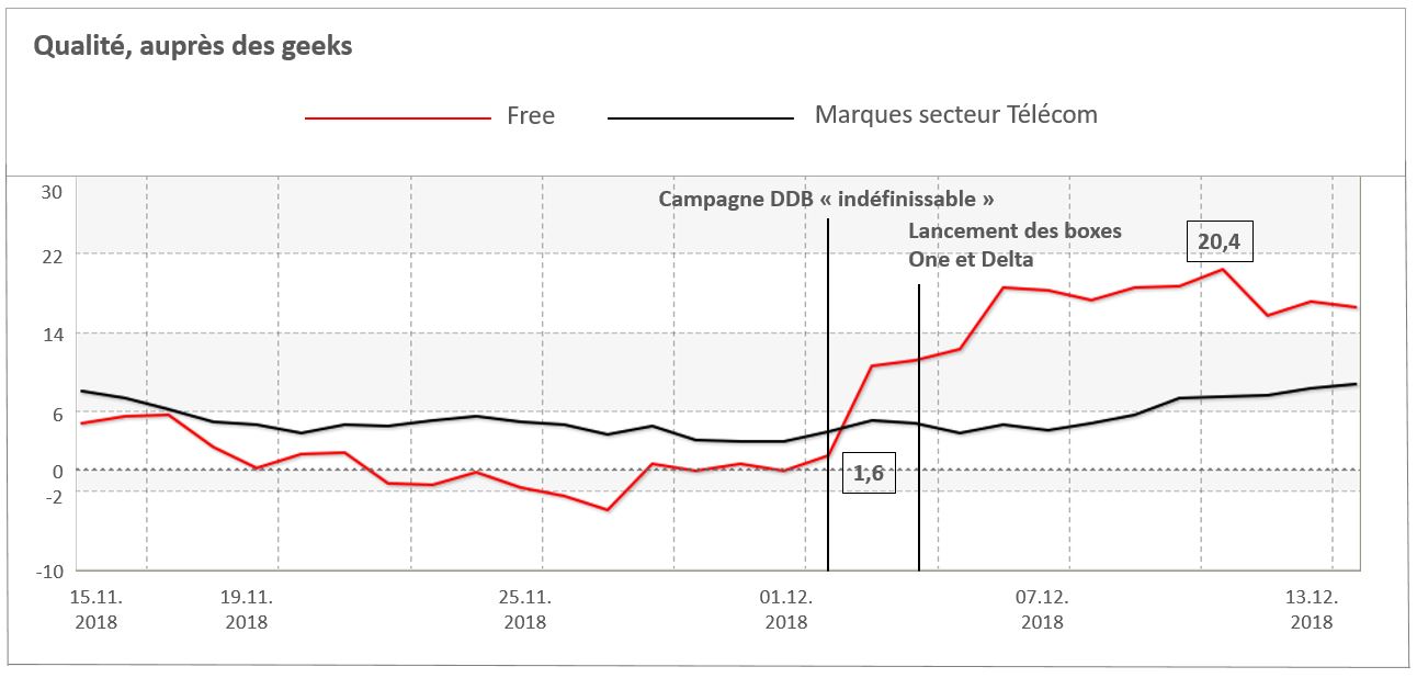 De la même manière, le lancement de ces deux box permet à Free de gagner 18,8 points sur l’indicateur de Qualité chez les férus de technologie. La marque rattrape et dépasse ainsi largement la moyenne du secteur, note YouGov.
