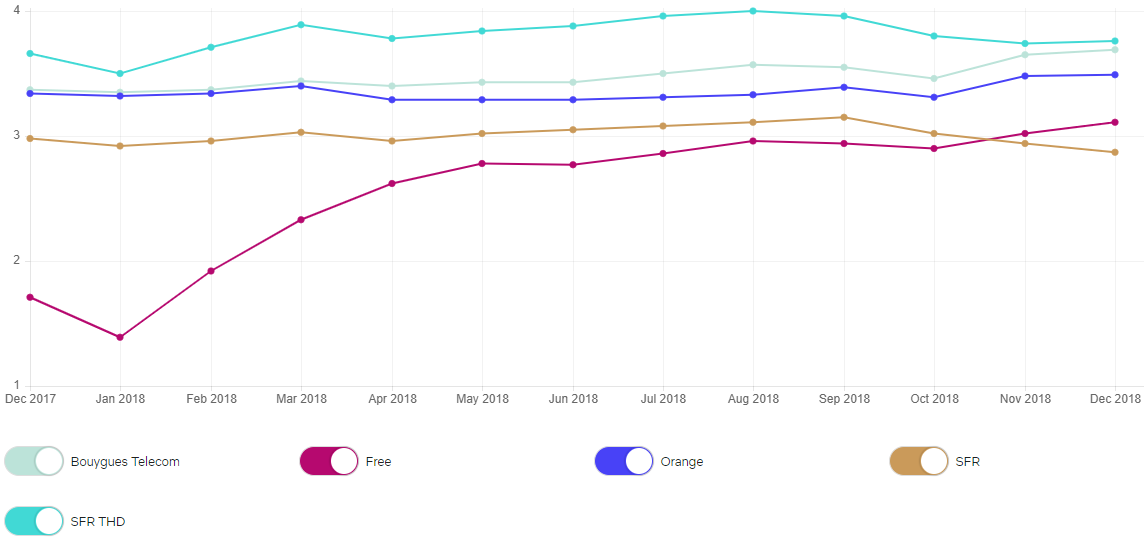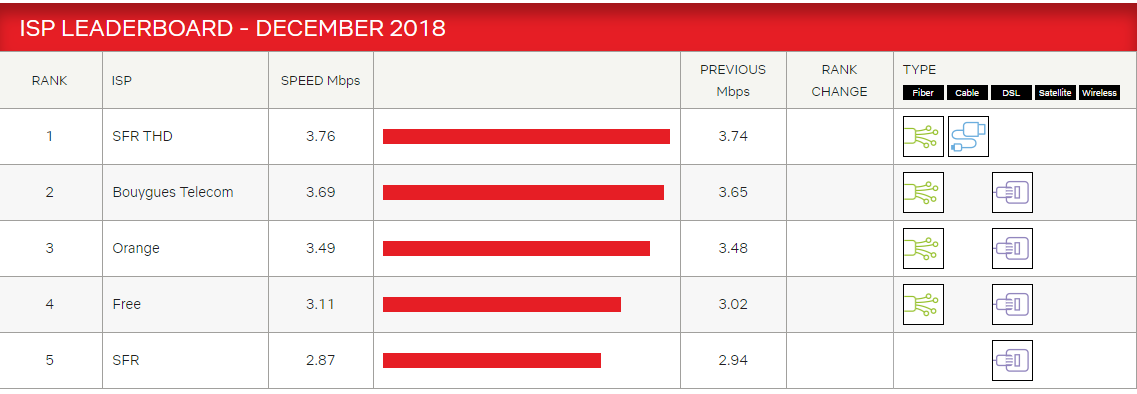 Concrètement, au cours du mois de décembre SFR "câble et FTTH" conserve sa place de numéro un avec un débit moyen de 3,76 Mbits/s en hausse par rapport au mois dernier (3,74 Mbits/s). En deuxième position, Bouygues Télécom, affiche 3,69 Mbits/s contre 3,65 Mbits/s le mois précédent. A la 3ème place on trouve Orange avec 3,49 Mbits/s, en augmentation par rapport à octobre. Free se place en 4ème position, avec 3,11 Mbits/s (contre 3,02 Mbits/s le mois d’avant), soit la plus grosse progression du mois (+0,9 Mbits/s) et enfin SFR "ADSL" à la 5ème place avec 2,87 Mbits/s, qui continue à baisser.