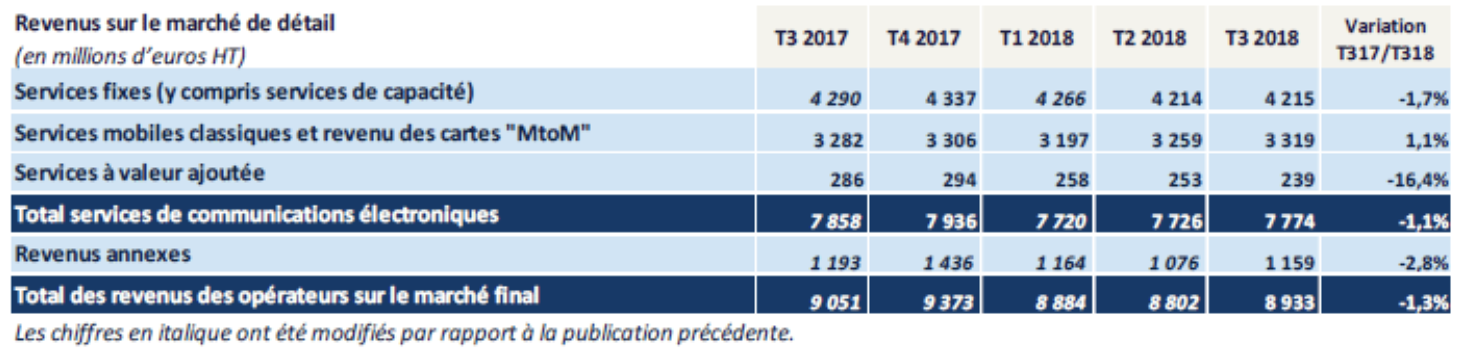 Principal enseignement du troisième trimestre selon le régulateur, le revenu des opérateurs recule pour la première fois en 2018. Sur le marché final, celui-ci atteint 8,9 milliards d’euros HT, soit une diminution de 1,3% en un an et ce après une stabilité au premier semestre de l’année. L’explication, ce recul provient principalement de la baisse plus intense du revenu des services fixes ce trimestre (-1,7% en un an contre -1,2% environ les deux trimestres précédents), lequel constitue 48% de l’ensemble des revenus. "A cela s’ajoute une diminution des revenus annexes et, en particulier, de celui des revenus des terminaux mobiles (814 millions d’euros HT) qui baisse pour la première fois en 2018 (-3,3%)", justifie la police des télécoms avant d’ajouter que celui des services à valeur ajoutée est en recul depuis plus de six ans (-16,4% en un ce trimestre).