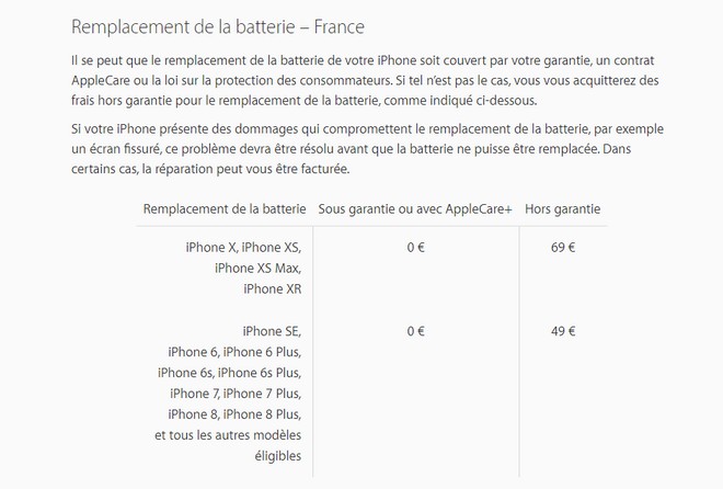 La promotion est désormais terminée. D’ailleurs, concernant les tarifs en vigueur, le remplacement de batterie coûte 69 euros pour les iPhone X, iPhone XR, iPhone XS et iPhone XS Max. Pour les autres, il faut compter 49 euros. Sous garantie ou avec AppleCare+, c’est gratuit.