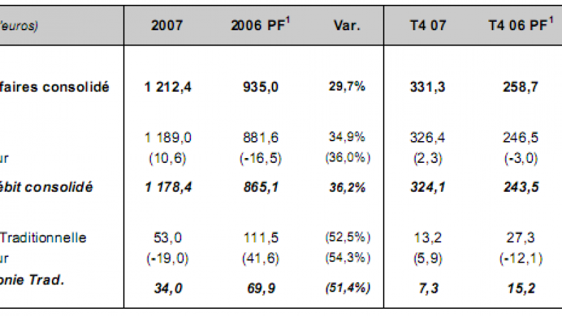 ARPU record à 36,3 euros au T4 2007, tiré par la croissance des services optionnels à valeur ajoutée Freebox (+61% en 2007)