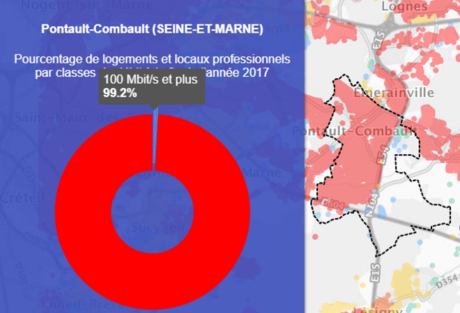 Grâce à la première carte on peut voir que la ville de Pontault-Combault est couverte à 99.2% par le très haut débit.