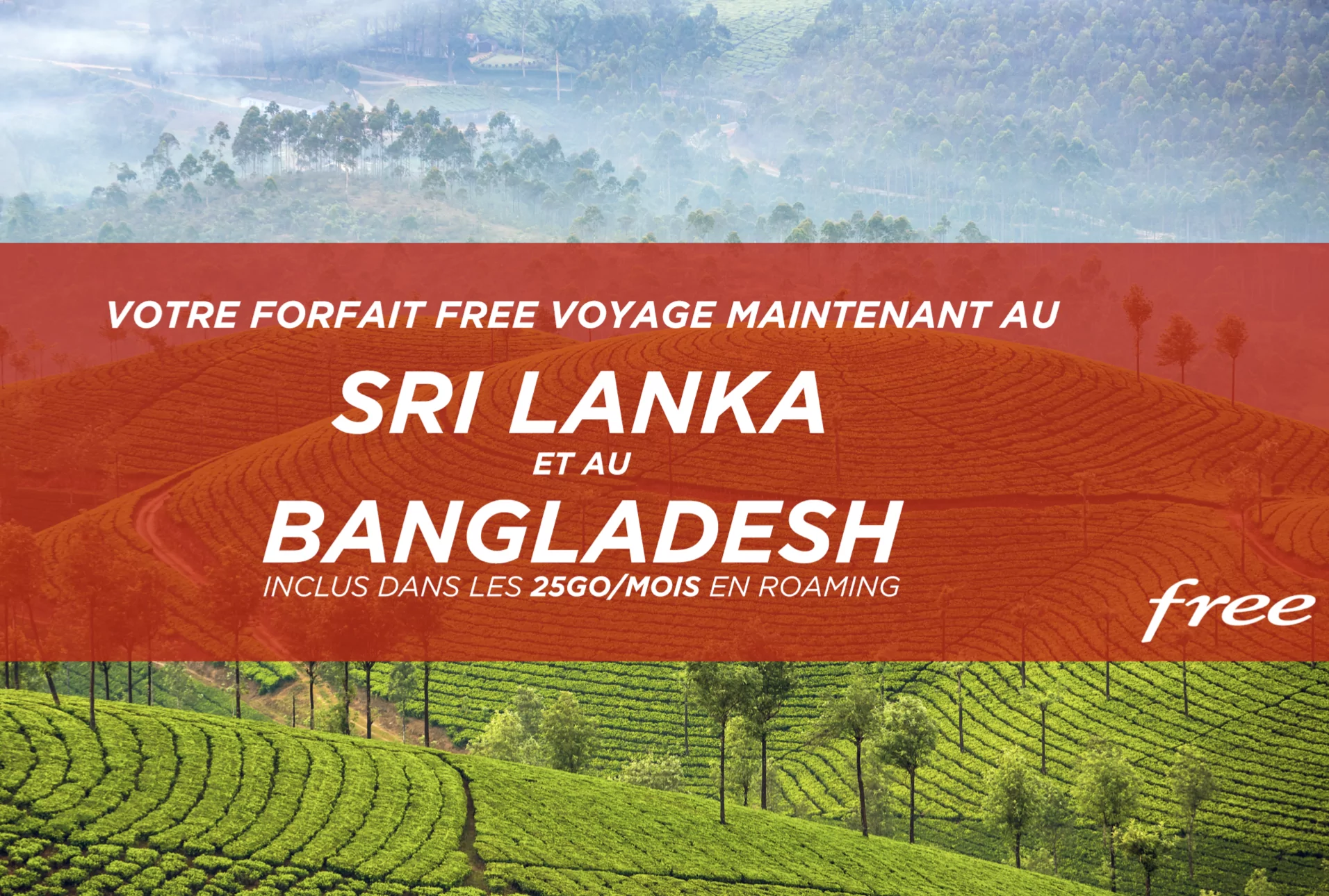 En plus de l’Inde, la Malaisie et la Thaïlande, Free Mobile annonce aujourd’hui intégrer le Sri Lanka et le Bangladesh parmi les destinations bénéficiant de l’enveloppe de 25Go/mois d’Internet mobile en roaming incluse dans son forfait le plus onéreux 100 Go à 19,99€.