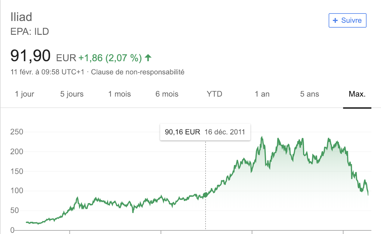 Bien qu’il reprenne légèrement des couleurs ce matin (+1,80%), le titre de la maison-mère de Free a conclu vendredi la séance à 90,04 euros, plombé par une baisse de son cours de 5,22 % dans la journée. Depuis mai 2017, soit son niveau le plus haut à 235 euros, la chute est vertigineuse, plus de 60 % soit "7,2 milliards d’euros de capitalisation boursière qui sont partis en fumée, avec une valorisation tombée à 5,4 milliards d’euros", note Le Figaro.