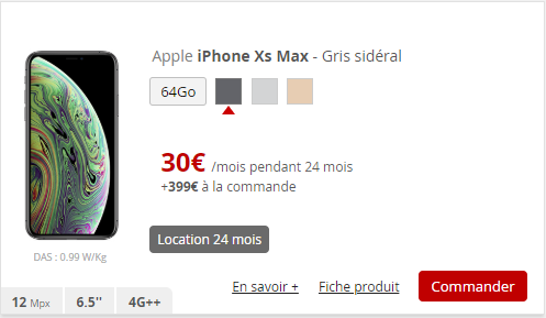 iPhone XS Max le montant du loyer mensuel passe de 26€ à 30€ durant 24 mois. A l’inverse, le montant à payer à la commande diminue et passe de 449€ à 399€