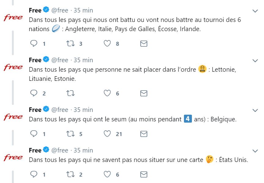 Une carte des (gentils) clichés donc pour présenter ces nouvelles destinations et si vous souhaitez voir l’ensemble des tweets, vous pouvez retrouver le thread sur ce lien ou aller sur le compte twitter de Free.