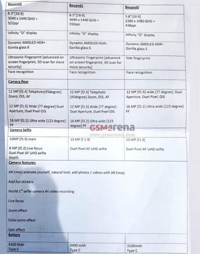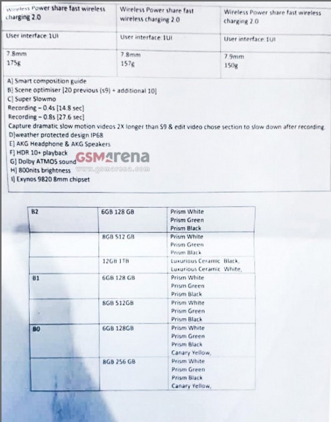 Les trois modèles auraient en commun un écran Infinity-O, avec un ou deux trous percés pour accueillir les capteurs à selfies. Ils partageraient également un chipset Exynos 9820 gravé en 8 nanomètres et la recharge sans-fil rapide.