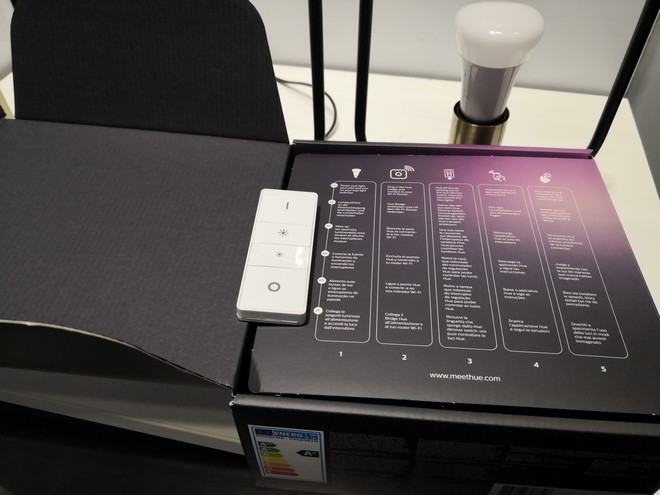 La procédure d’installation est expliquée de manière claire sur l’un des rabats de la boîte. Les ampoules peuvent être utilisées sur n’importe quelle lampe compatible (diamètre et type de douille, puissance), tandis que le pont s’alimente sur secteur et se branche sur l’un des ports Ethernet du serveur Delta.