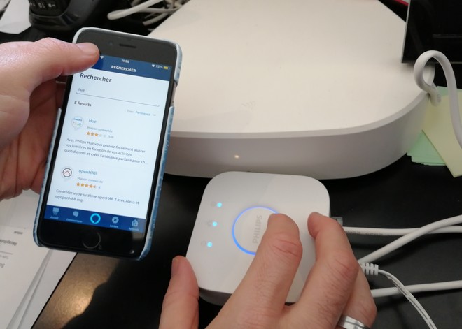 Continuons avec le paramétrage dans l’application Alexa pour l’ajout du pilotage à la voix. Il faut en effet installer un skill dédié pour en profiter. La procédure nécessite d’être près du pont Hue pour appuyer sur le bouton de synchronisation, et donc d’être à proximité du serveur Delta.